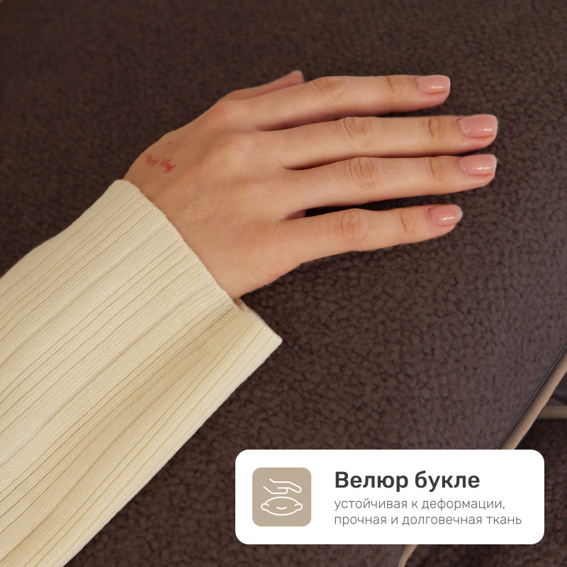 Обивка из букле придаёт мебели особую фактурность и уют. Эта ткань отличается мягкостью, износостойкостью и визуальной глубиной, создавая ощущение тепла и комфорта. Диван не только красиво выглядит, но и приятен на ощупь, что делает его отличным вариантом для ежедневного использования.