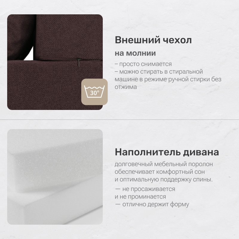 Отдельное преимущество — доставка в вакуумированном виде. Это позволяет значительно снизить объем при транспортировке, упростить подъём в квартиру и сохранить чистоту изделия. После распаковки диван быстро принимает свою форму и готов к использованию.