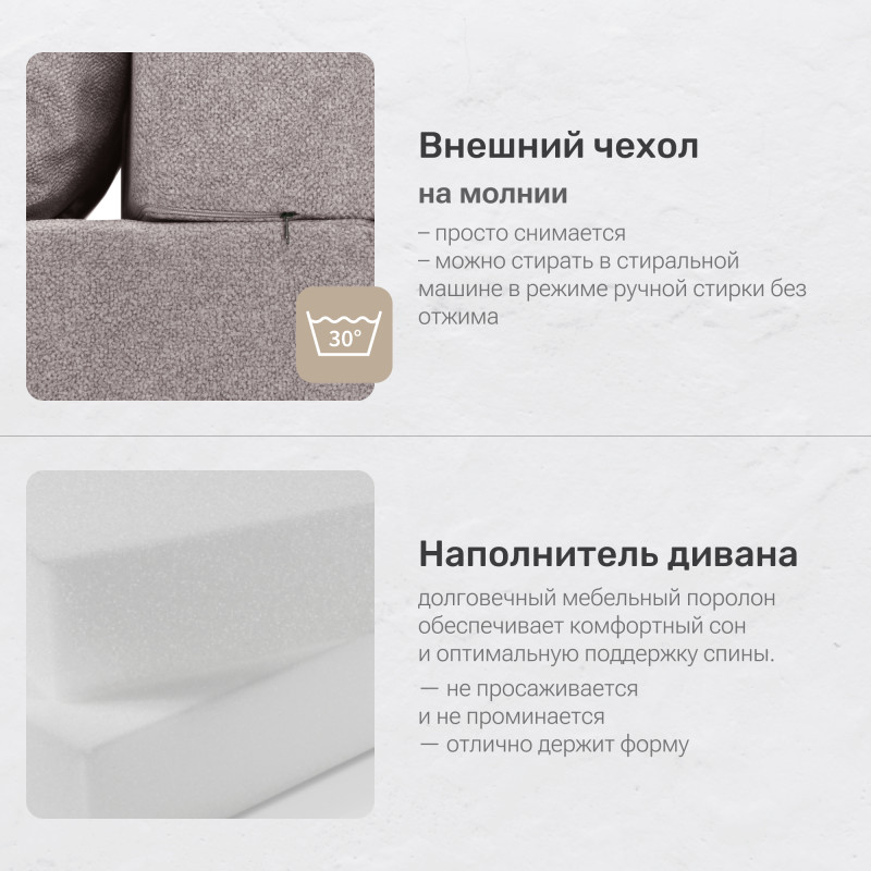 Отдельное преимущество — доставка в вакуумированном виде. Это позволяет значительно снизить объем при транспортировке, упростить подъём в квартиру и сохранить чистоту изделия. После распаковки диван быстро принимает свою форму и готов к использованию.