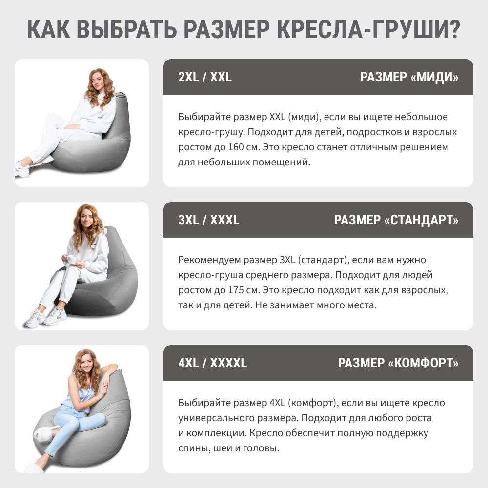 Широкое место для сидения, высокая спинка, место для рук - размер Комфорт лидер по удобству среди самых комфортных кресел-мешков.- Материал внешнего чехла: мебельная , бархатистая и плотная ткань высокого качества.